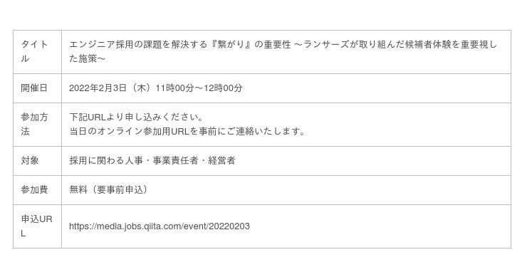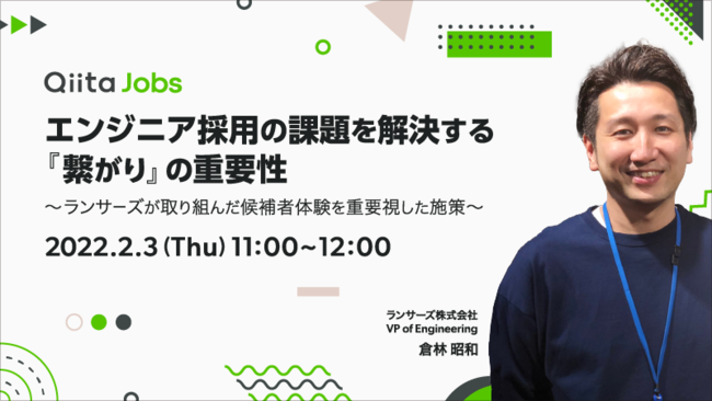 株式会社エイチームのグループ会社であるQiita株式会社(本社:名古屋市中村区、代表取締役社長:柴田健介)は、オンラインセミナー「エンジニア採用の課題を解決する『繋がり』の重要性 ~ランサーズが取り組んだ候補者体験を重要視した施策~」を2022年2月3日(木)に開催します。