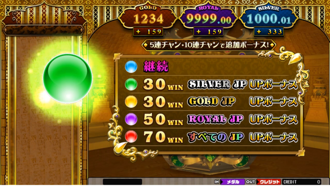 新ゲームの「ガラポンチャンス」では出たボールの色によって3つのJACKPOTが成長し、続けば続くほどWINを貰える物理抽選ゲームです。さらに抽選が連続するほどボーナスメダルや、ロイヤルジャックポットチャンスに挑戦できる大チャンス!