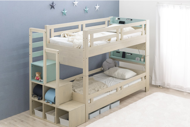 今回発売した二段ベッドは、手すり付きの階段になっている為、足をしっかり乗せて上り下りができるのではしごよりも安心してご使用いただけます。さらに、階段下のスペースを有効活用する為に階段はオープンラックになっているので、収納ボックスやお気に入りのおもちゃなどたっぷり収納することができます。
