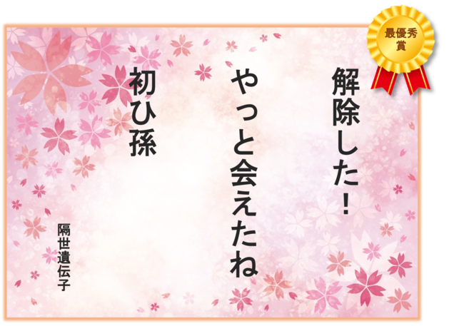 “解除した!”のワードが一番頭にくる部分に、緊急事態宣言解除、そして祖母に会うことを待ちわびていたという気持ちがよく表れています。長引くコロナ禍で家族の絆の深さを感じさせる心温まる作品が最優秀賞に輝きました。自粛生活が続くなか、会いたい人にいつでも会えるという状況がどれだけ尊いことかを実感した人も多いでしょう。しかし、たとえ世界がどのような状況にあっても、脈々と受け継がれていく命のバトンを大切に繋いでいかなければならないと、改めて気付かせてくれる作品です。