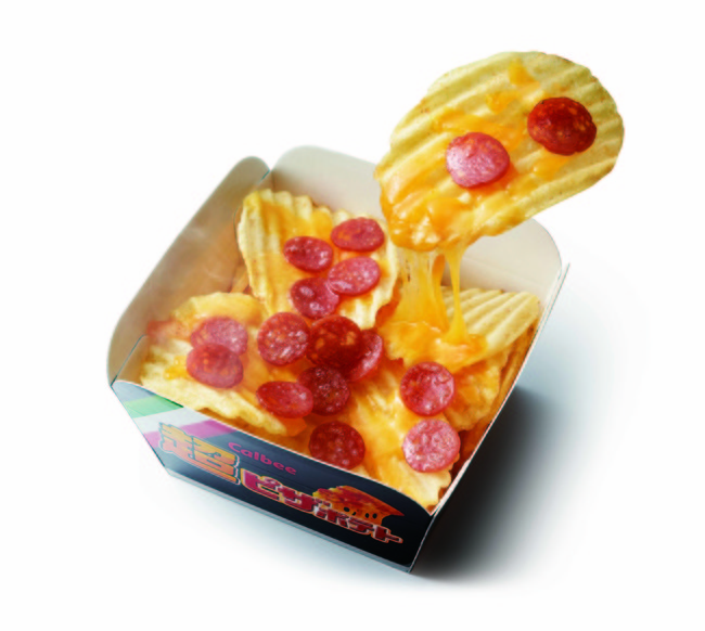 今回のリニューアルでは、風味と食べ応えがアップするレッドチェダーチーズを使用し、サラミをトッピングした後グリラーで加熱する工程を加えました。加熱することでサラミはよりジューシーに、チーズはとろけて本物のピザに近い味わいとなります。「カルビープラス」だから実現できる商品であり、お菓子として、また、食事としても満足いただけます。容器も超ピザポテトオリジナル仕様となっていて見た目でも楽しんでいただけるように工夫しました。