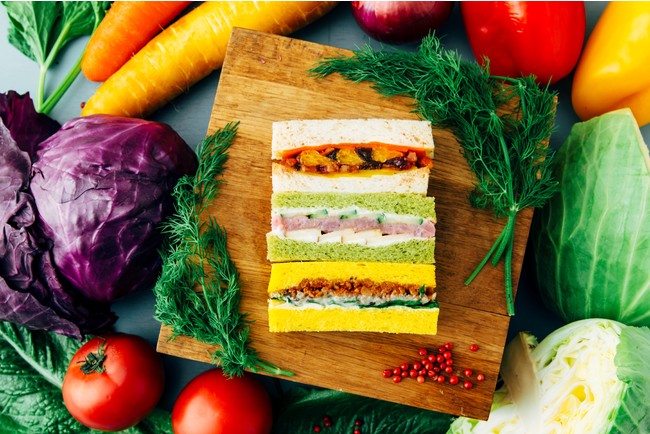 乳・卵を使わずフワフワに焼き上げたプレーン、ほうれん草、かぼちゃ風味のヴィーガン食パンを使用した、ヴィーガンサンドウィッチのアソートボックスです。