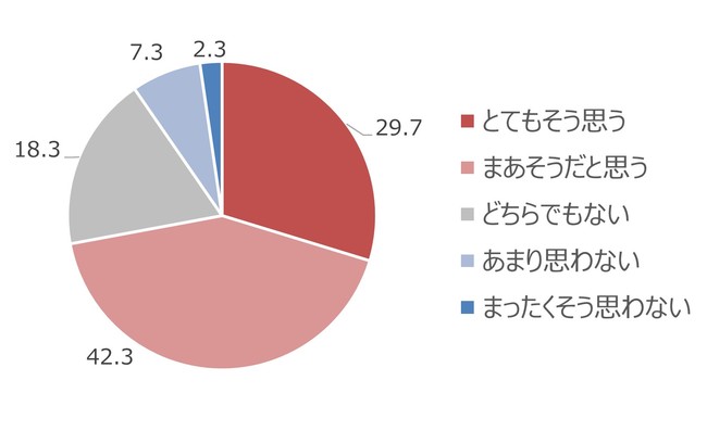 「とてもそう思う(29.7%)」と「まあそうだと思う(42.3%)」を合わせ、「どちらかというと愛妻家」だと思っている男性の割合は7割以上と、過半数を占める結果に。また、愛妻家度を数値で表した際の自己評価平均値は、約72点でした。