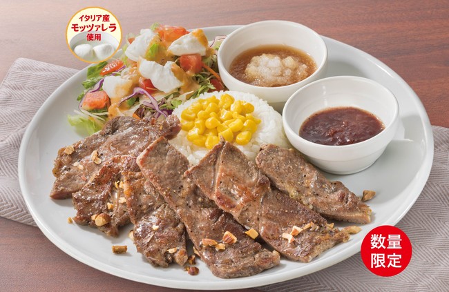 食べやすいサイズにカットした柔らかいステーキと味の変化が楽しめる2種ソース(おろしぽん酢、シャリアピン)に、さっぱりとしたイタリア産モッツァレラのサラダを添えたライスプレートです。
