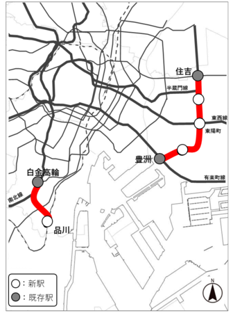南北線延伸(品川・白金高輪間)の周辺地域である品川駅周辺は、リニア中央新幹線の整備を契機に、東京と国内外の広域的な交通結節点として期待され、新たな国際競争力強化の拠点として、多様な機能が集積する再開発エリアであります。本路線は、品川駅で山手線、東海道線等のJR 東日本主要幹線、羽田空港に連絡する京急線、東海道新幹線と接続し、六本木・赤坂等との都心部のアクセス利便性向上等に寄与します。