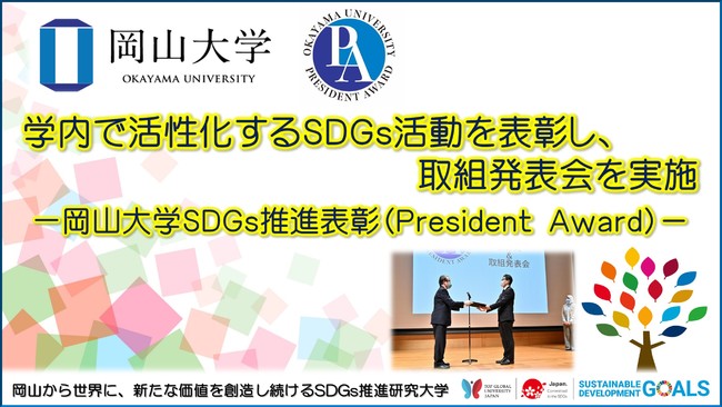 国立大学法人岡山大学(本部:岡山市北区、学長:槇野博史)は2022年1月18日、岡山大学SDGs推進表彰(President Award)の表彰式および取組発表会を創立五十周年記念館で実施しました。この推進表彰はSDGs推進本部が学内におけるSDGs推進のための取り組みを普及推進することを目的に実施。今年度は、教育、研究、業務、学生グループの4分野から取り組みを募集し、16件の申請の中から優秀賞6件、奨励賞5件の計11件を表彰し、それぞれの取組内容について発表が行われました。