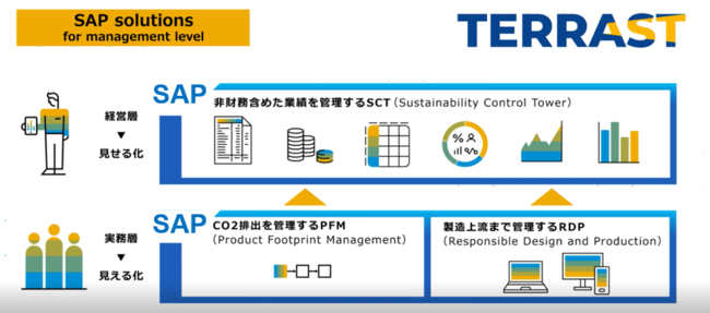 サステナブル・ラボの提供するESG/SDGsに特化した非財務ビッグデータプラットフォーム「TERRAST β」と、SAPの各種ERPソリューション(SCT、PFM、RDP等)を連携させることで、より多くのデータに基づいた解析を行います。