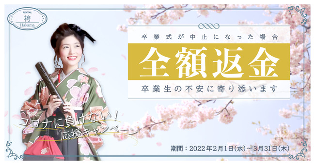 そこで当社ではこのようなご不安になられている卒業生へ寄り添い、安心して袴レンタルをご利用いただきたく、新型コロナウイルス感染症の影響で卒業式が中止になった場合は“全額返金”となる「コロナに負けない!応援キャンペーン」をきものレンタルwargo5店舗にて2022年1月31日(月)~3月31日(木)の期間で実施します。