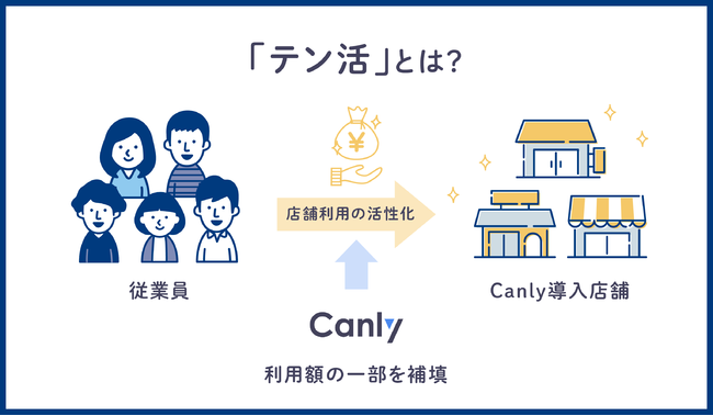 「テン活」とは、”店舗ビジネスの活性化に向けた活動”の略で、カンリーの従業員が「Canly(カンリー)」を導入いただいている店舗を利用する際に、利用金額の一部を会社が補助する制度です。