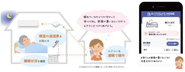 寝室の温度や湿度が高く(低く)なったら、専用アプリへの通知を確認し、エアコンを遠隔で操作*5することができるため、熱中症になりやすい季節もご家族の安心をサポートします。