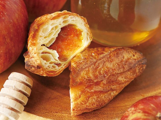 直営店舗「お菓子工房 ぶんぶんファクトリー」で販売しているオリジナルアップルパイで、山田養蜂場のオレンジ蜂蜜(メキシコ産)と、リンゴの代表的品種「ふじ」(青森県産)を使用しています。パイ生地を焼き上げた後にジュレやカスタードクリームを入れることで、サクサクとした食感とじゅわっとあふれるフィリング(具材)が味わえます。店内に設置している専用オーブンで、パイが焼き上がる様子を見ることもできます。
