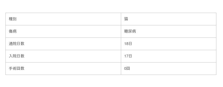 事例の猫の糖尿病の通院日数、入院日数、手術回数について