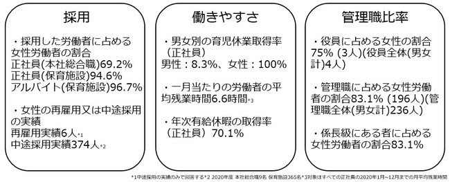 採用されてから仕事をしていく上で、女性が能力を発揮しやすい職場環境であるかという観点から、5つの評価項目(1.採用 2.継続就業 3.労働時間等の働き方 4.管理職比率 5.多様なキャリアコース)が定められていて、その実績を「女性の活躍推進企業データベース」に毎年公表することが必要です。