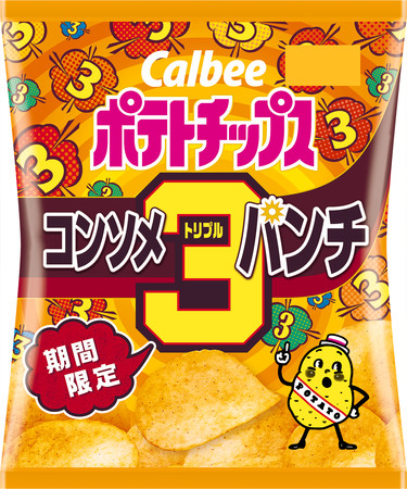 カルビーは、コンビニエンスストア限定の定番商品「コンソメWパンチ」など1978年に誕生したロングセラー商品「ポテトチップス コンソメパンチ」の可能性を追求し、さまざまな商品を発売しております。コンソメ風味を3倍にした「コンソメトリプルパンチ」は、濃い味を望むお客様の声にお応えした商品です。近年は、パッケージや中身を変更しながら、毎年期間限定発売しております。直近では、昨年2月に発売してお客様より大変好評をいただきました。そこで、今年も中身とパッケージを改良して再発売する運びとなりました。