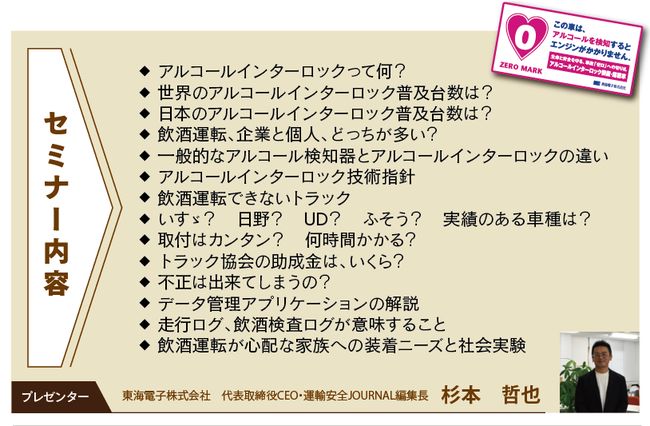 飲酒運転防止のためのアルコール検知器及びIT点呼システムを開発・販売する東海電子株式会社(本社:静岡県富士市 代表取締役:杉本 哲也)は、 この度、 『アルコール・インターロック入門セミナー』(無料)を2月16日(水)に開催いたします。