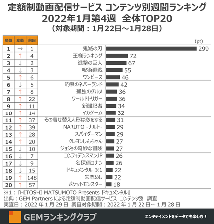 エンタテイメント業界に向けたデータ×デジタルマーケティングサービスを提供するGEM Partners株式会社(ジェムパートナーズ、所在地:東京都港区、代表取締役:梅津文)は2月3日(木)、エンタメコンテンツランキングやデータ情報を発信する「GEMランキングクラブ」プロジェクトにて作成した2022年1月第4週の「定額制動画配信サービス コンテンツ別週間ランキングTOP20(実査日:2022年1月29日、調査対象期間:1月22日~1月28日)」を発表します。