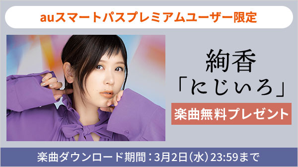 映像・音楽・書籍・ライブなどのエンタメサービスがau、docomo、SoftBankなど、どの携帯キャリアでもいつでもお楽しみいただける「auスマートパスプレミアム」は、2022年2月3日(木)10時から会員限定・1カ月の期間限定で、絢香の人気楽曲「にじいろ」を無料ダウンロードプレゼントいたします。