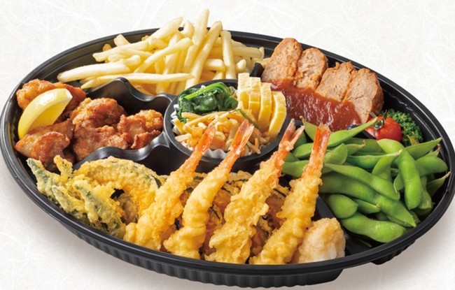 天ぷら(上海老・かぼちゃ・おくら)・若鶏の唐揚げ・ポテトフライ・ハンバーグ・枝豆・玉子焼き・おひたし・彩り昆布煮