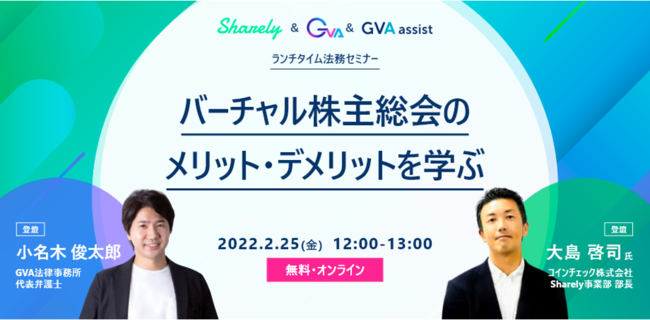 今回のセミナーでは、事業会社で株主総会の実務経験もあり、現在も上場企業の監査役として株主総会の運営をサポートしている、弁護士法人GVA法律事務所 共同代表 小名木 俊太郎 弁護士と、オンリー型を含む多くの上場企業のバーチャル株主総会の実現・成功を支援している、バーチャル株主総会支援サービス「Sharely(シェアリー)」事業責任者の コインチェック株式会社 Sharely事業部 部長 大島 啓司の2人が、事例をふんだんにまじえて、バーチャル株主総会のメリット・デメリット等をお話しいたします。