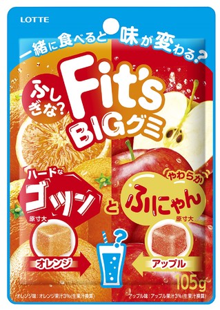 2つ一緒に食べると・・・味が変わる! 2つの異なる食感とフレーバーをアソート。Fit’sシリーズからふしぎな?グミが新登場!「ふしぎなFit’s BIGグミ<オレンジ&アップル>」を発売します。