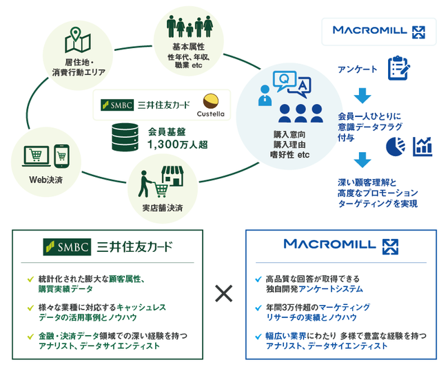 三井住友カード会員様(以下:カード会員様)に向けたアンケート結果とカード会員様のキャッシュレスデータを組み合わせ、「Custella」の分析力を向上させることで、企業のマーケティング活動の支援強化を目指します。