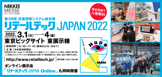 概要 :第38回流通情報システム総合展「リテールテックJAPAN 2022」を3月1日(火)から4日(金)までの4日間、東京ビッグサイトで開催します。人手不足や物流などの構造変化に伴う流通DXが喫緊の流通・小売業界向けにソリューションを提供する代表的な企業が一堂に集結。多数の体験型展示も行います。