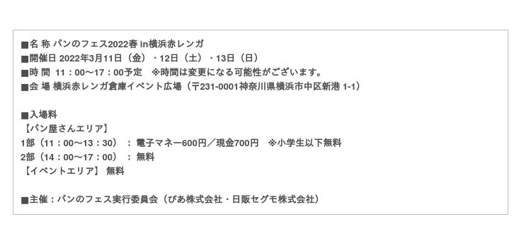 レジャー・エンタテインメントのチケット販売及び各種イベントの企画・運営等を行うぴあ株式会社(代表取締役社長 矢内廣) と、「パンシェルジュ検定」を運営する日販セグモ株式会社(代表取締役社長 安井邦好) は、2022年3月11日(金)~ 13日(日)の3日間、横浜赤レンガ倉庫イベント広場にて「パンのフェス2022春 in横浜赤レンガ」を共同で開催。本日2月10日より、さまざまな特典が付いた入場チケット3種の発売を開始しました。