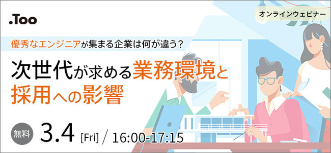 クリエイティブ市場の総合商社・株式会社Too(本社/東京都港区虎ノ門3-4-7、社長/石井剛太、資本金/1億円)は、オンラインLIVE配信セミナー「優秀なエンジニアが集まる企業は何が違う?次世代が求める業務環境と採用への影響」を2022年3月4日(金)に開催します。