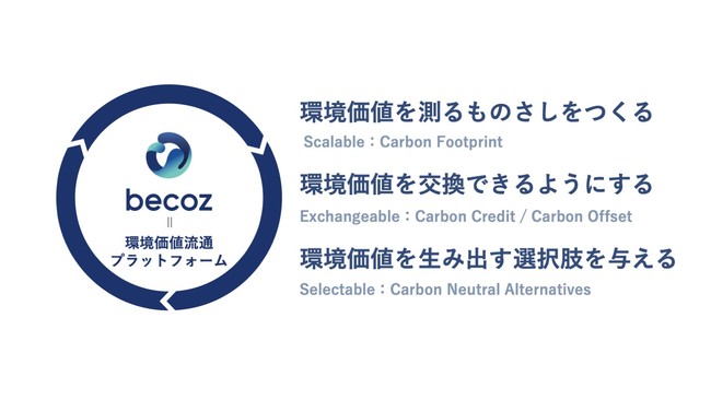 「Be(Be動詞)」「CO2」「Zero」というキーワードの頭文字からなるサービス名『becoz』は、生活者一人一人が商品やサービスを選ぶ際に、環境負荷・環境価値という新しい視点をもとに判断し、環境価値を流通させる主体となっていくという本事業の世界観を表現しています。