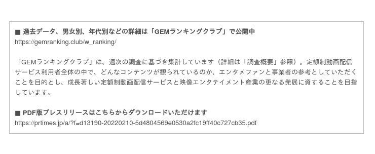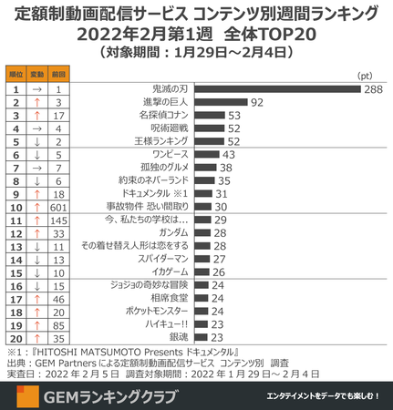 エンタテイメント業界に向けたデータ×デジタルマーケティングサービスを提供するGEM Partners株式会社(ジェムパートナーズ、所在地:東京都港区、代表取締役:梅津文)は2月10日(木)、エンタメコンテンツランキングやデータ情報を発信する「GEMランキングクラブ」プロジェクトにて作成した2022年2月第1週の「定額制動画配信サービス コンテンツ別週間ランキングTOP20(実査日:2022年2月5日、調査対象期間:1月29日~2月4日)」を発表します。