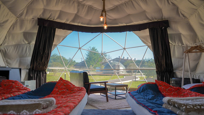 1番人気の客室です。森をイメージしたグリーンが特徴的な、ドーム型のテントです。エアコン・冷蔵庫付きで、客室前には広々デッキがございます。