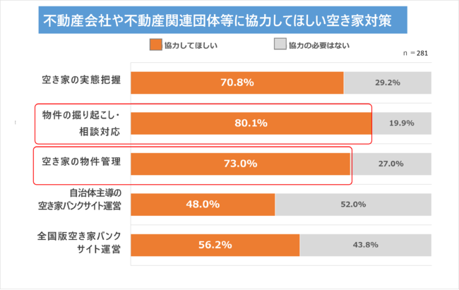 協力してほしいと感じている空き家対策については、「物件の掘り起こし・相談対応」が80.1%と最も多く、次いで、「空き家の物件管理」が73.0%と続きました。単独での対策に課題を感じている自治体が多いようです。