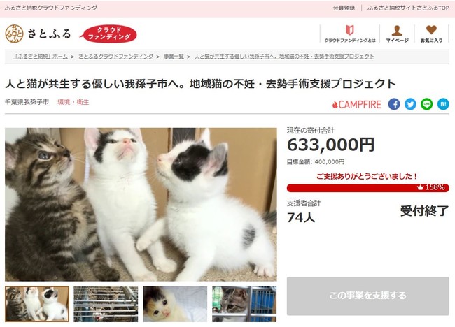 2019年度に実施した「さとふるクラウドファンディング」では、目標を上回る寄付金をお寄せいただき、地域猫への不妊去勢手術に対する補助を交付希望団体の要望どおりに行うことができました。