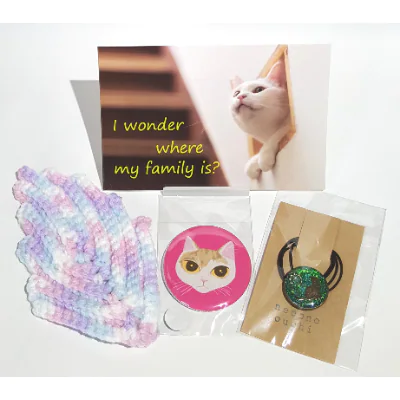 高槻ねこの会が運営する「ねこのおうち」の猫たちを撮影した写真を使ったオリジナルのポストカード、ボランティアの方手作りのアクリルたわし、猫モチーフ付きのヘアゴム、猫イラストの缶マグネットの保護猫応援グッズセット。本セットに寄付することで「ねこのおうち」で暮らす保護猫たちのご飯代や医療費の確保、里親とのご縁を結ぶ譲渡会運営の支援に繋がります。