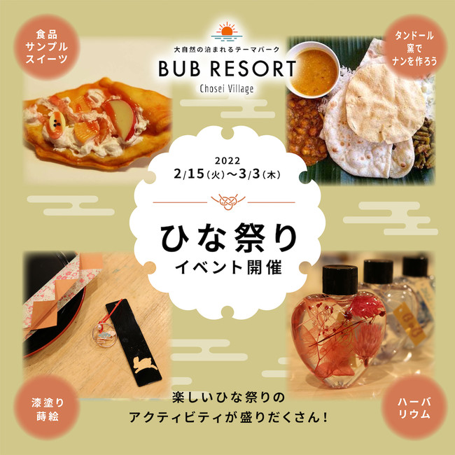 株式会社BUB(東京都品川区、代表取締役 一戸 悠人)が運営するBUB RESORT Chosei Village(千葉県長生郡)では、2月15日~3月3日にひな祭りシーズン限定のアクティビティを実施。季節ごとに実施するアクティビティが変わり、何度来ても楽しめるサービスを提供。