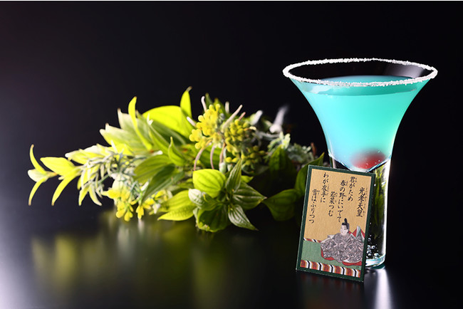 春の野原で若菜を摘む若き親王だった頃の光孝天皇。その爽やかなイメージを、ブルーベリーの甘酸っぱいカクテルにしました。着物の袖に降りかかっては消えていく春の淡雪になぞらえて、バーテンダーがカクテルを注ぐと綿菓子がすっと溶けていく様子をお楽しみいただきます。