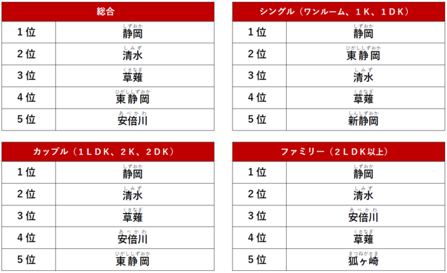 2LDK以上のファミリー向き物件では、「静岡」駅がトップでした。2位は「清水」駅、3位は「安倍川」駅がランクインしました。
