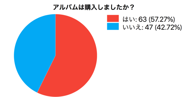 「Q2.アルバムは購入しましたか?」と質問したところ、「はい」が63%「いいえ」が47%という結果になりました。