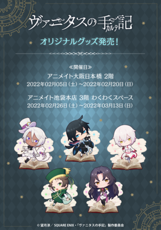 株式会社イーディスから、TVアニメ「ヴァニタスの手記」の描き起こしイラストを使用した全6商品がアニメイト大阪日本橋 2階・アニメイト池袋本店 3階 わくわくスぺースの2店舗にて発売されます。