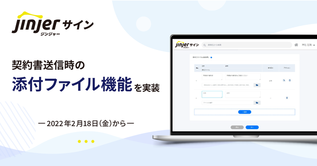 jinjer株式会社(本社:東京都新宿区、代表取締役CEO:加藤 賢)が提供する、バックオフィス向けクラウドサービス「ジンジャーサイン」に、契約書送信時の添付ファイル機能を2月18日(金)から正式に実装することをお知らせいたします。
