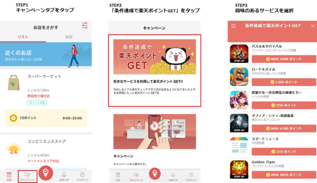 今回の機能実装により、「楽天チェック」アプリ内のキャンペーンタブに「条件達成で楽天ポイントGET」が追加され、そこに掲載されているアプリインストールなどの条件を達成することで「楽天ポイント」が獲得できます。
