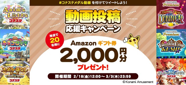 期間中に、対象タイトルの「コナステ メダルゲームコーナー」のプレー動画を撮影して、Twitterで投稿すると、Amazonギフト券2,000円分を抽選で20名様にプレゼントいたします。