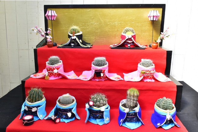 今回で9回目を迎え新たな“春の風物詩”となりつつある本イベントでは、お内裏さまとおひなさま、三人官女、五人囃子の装束をまとったサボテン三段飾りを展示いたします。