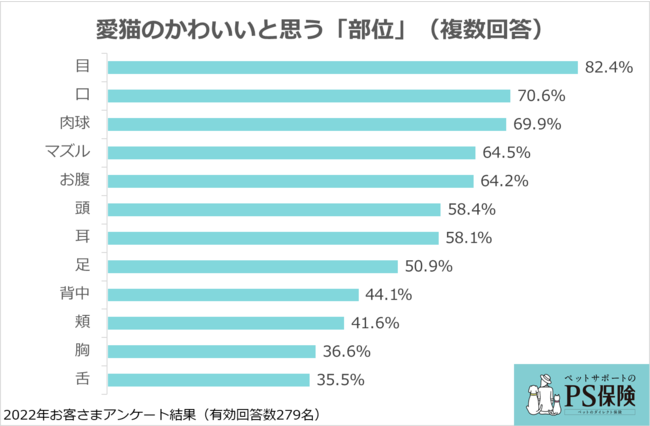 1位は、「目」(82.4%)で、まんまるで大きく、吸い込まれそうな瞳が、猫のかわいらしさの最たるものという結果となりました。