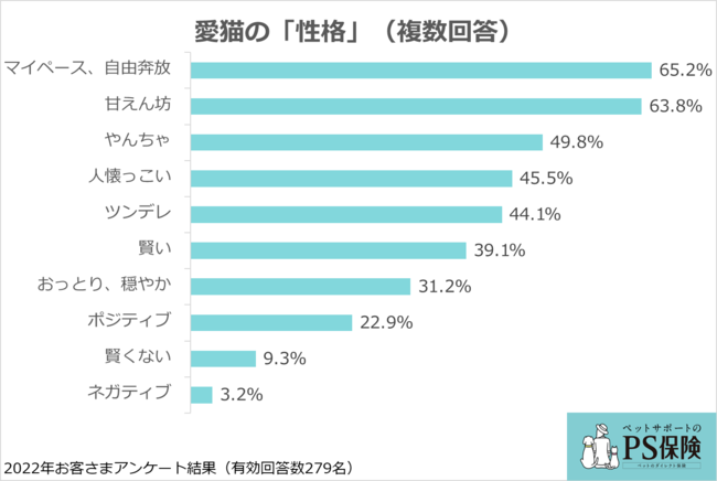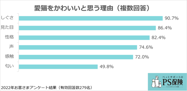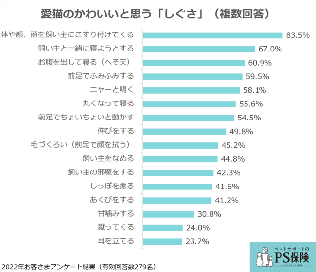 ペット保険の「PS保険」を提供する少額短期保険会社のペットメディカルサポート株式会社(本社:東京都港区赤坂、代表取締役社長:米満 明仁、以下『ペットメディカルサポート』)は、2月22日の「猫の日」にちなみ、当社ペット保険「PS保険」のご契約者さまで猫を飼われている方2,144名(有効回答数279名)を対象に、愛猫のかわいらしさに関するアンケート調査を行いました。