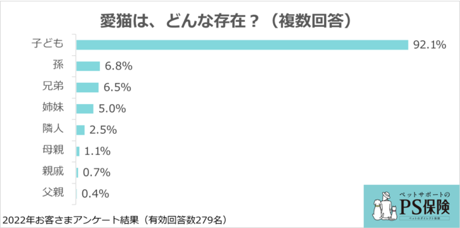 愛猫の存在について伺ったところ、1位は「子ども」(92.1%)でした。2位は「孫」(6.8%)、3位は「兄弟」(6.5%)という結果になりました。