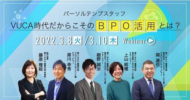 総合人材サービスのパーソルグループで人材派遣・アウトソーシング事業を手掛けるパーソルテンプスタッフ株式会社(本社: 東京都渋谷区、代表取締役社長: 木村 和成、以下パーソルテンプスタッフ)は、「VUCA時代(*1)だからこそのBPO(*2)活用とは?」をテーマに、3月8日(火)・10日(木)の2日間、オンラインセミナーを開催します。