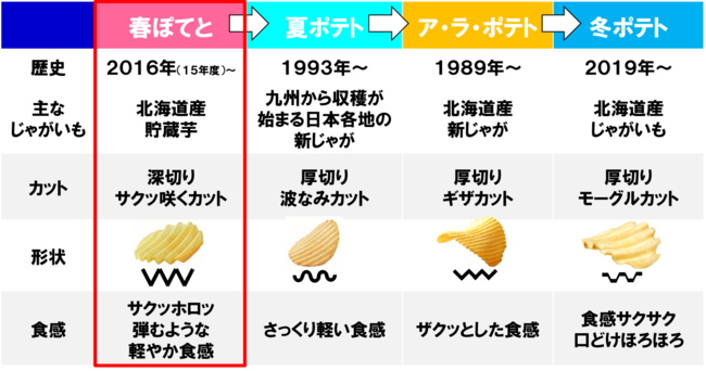 当社では、1年を通して季節に合わせたおいしさが味わえる“季節厚切りシリーズ”として、「春ぽてと」、「夏ポテト」、「ア・ラ・ポテト」(秋)、「冬ポテト」を販売しています。
