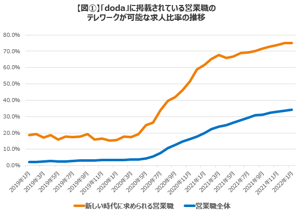 「doda」に掲載されている“新しい時代に求められる営業職” ※4のテレワークが可能な求人比率を2019年1月と2022年1月で比較すると、約4倍上昇していることが分かりました(【図1.】参照)。これは、2019年当時はWeb会議システムや契約書類の電子捺印などに伴う新たなシステムの導入が進んでおらず、出社しないと仕事が円滑に進められない状況があった中で、ノウハウが蓄積されていき、テレワークでも十分に能力が発揮できる状況が整備されてきたことに加え、オンラインツールを用いて顧客と接する「インサイドセールス」や「カスタマーサクセス」職はテレワークと親和性が高い仕事内容だったからだと考えられます。2019年1月度はテレワークが可能な求人比率は18.8%と低い状況でしたが、2022年1月では75.1%と飛躍的に上昇しています。