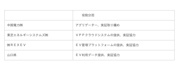 中国電力株式会社(本社:広島県広島市、代表取締役社長執行役員:清水 希茂)、東芝エネルギーシステムズ株式会社(本社:神奈川県川崎市、代表取締役社長:小西 崇夫)、株式会社REXEV(本社:東京都千代田区、代表取締役社長:渡部 健)および山口県(知事:村岡 嗣政)は、令和4(2022)年4月から岩国市と広島市にある電気自動車(以下、「EV」)を束ねて充放電制御するエネルギーマネジメント実証試験を開始します。